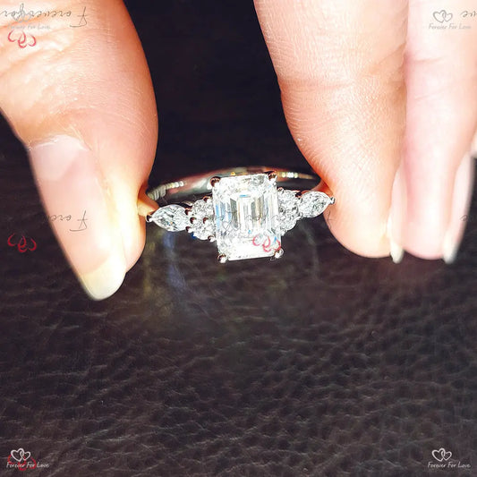 Emerald Cut Diamond Trilogy Engagement Ring with Marquise Side Diamonds