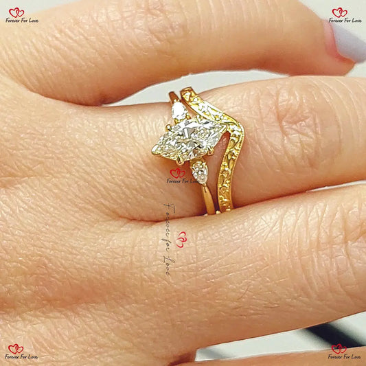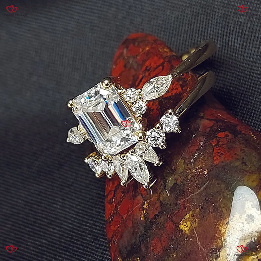 Emerald Cut Moissanite Engagement Ring Set – Vintage Unique Bridal Set with Marquise Curved Cluster in Gold