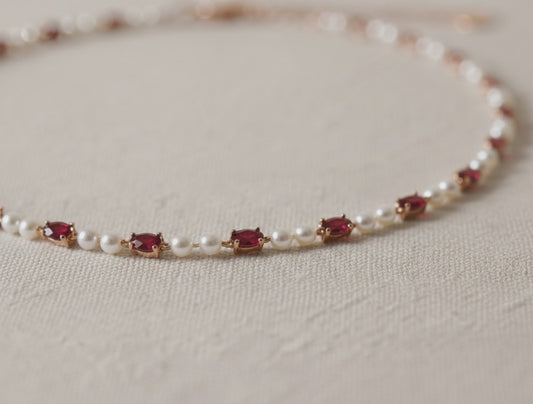 Ruby and Pearl Beaded Station Necklace, Solid Gold Chain, Dainty Ruby Gemstone Necklace, Gift For Her, Layering Necklace