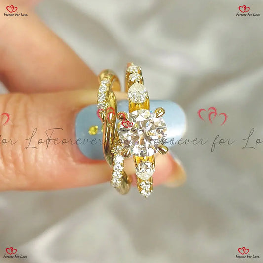 Antique Round Moissanite Engagement Ring Set with Pear Diamond Cluster in Rose Gold