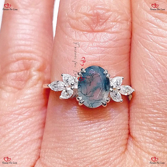 Natural Moss Agate Oval Engagement Ring with Marquise Diamond Accents