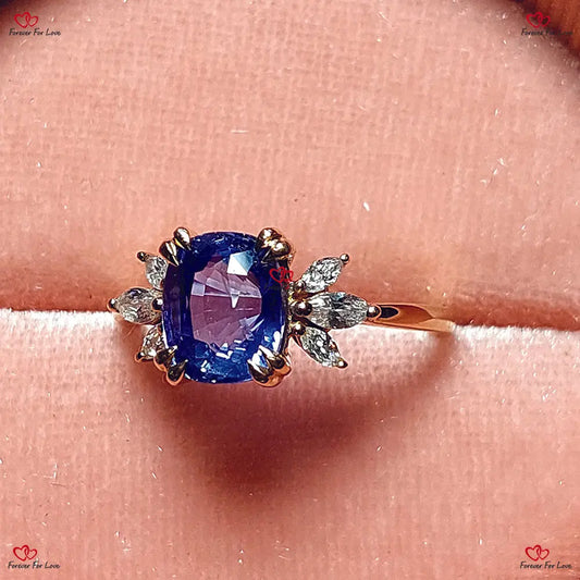 Bague de fiançailles vintage en saphir bleu | Saphir bleu naturel de Ceylan | Diamant marquise en or rose
