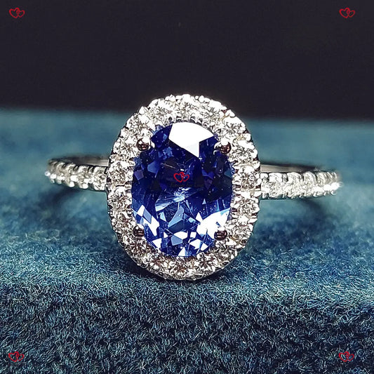 Bague de fiançailles unique en saphir bleu véritable taille ovale – Saphir bleu 13 x 9 mm avec halo caché de diamants