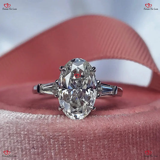 Bague de fiançailles en moissanite à taille ovale et baguette conique - Cadeau d'anniversaire unique à trois pierres de style vintage