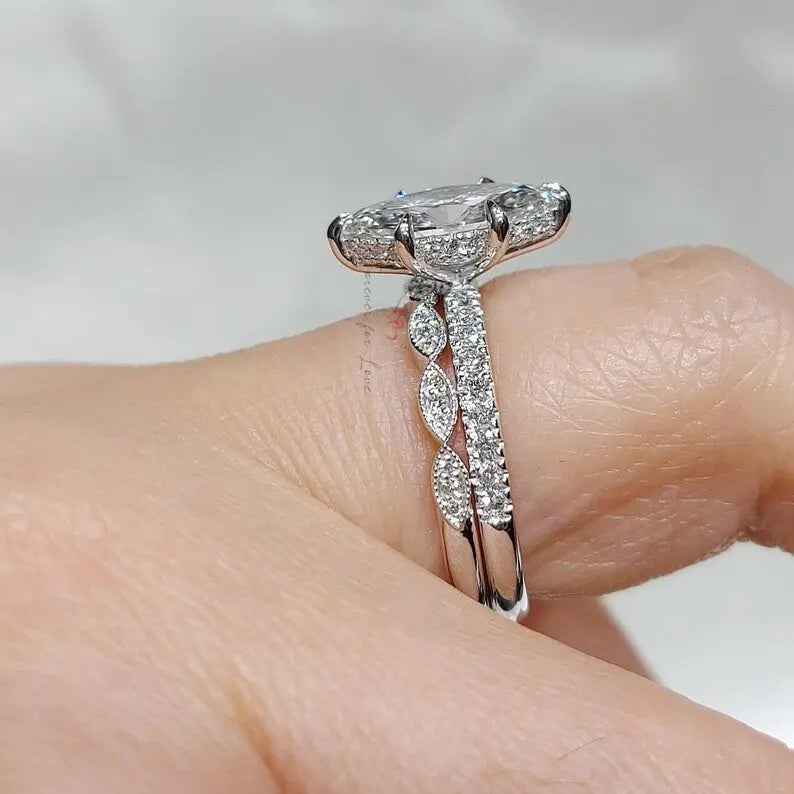 Each ring features a D color, VVS1 clarity moissanite, providing unmatched sparkle and timeless elegance. Whether you're proposing or upgrading her ring, this moissanite engagement ring set is a perfect symbol of commitment and grace. Complete with a matching wedding band for a cohesive and radiant look.