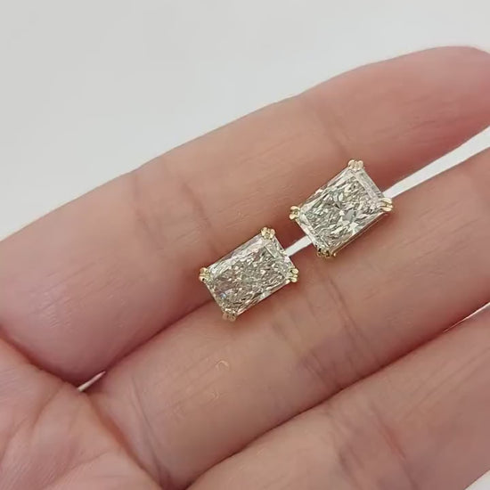 Each pair features hand-selected lab grown diamonds, known for their exceptional fire, brilliance, and ethical sourcing. The modern radiant cut combines the sparkle of a round with the clean lines of an emerald, creating a bold yet elegant look.