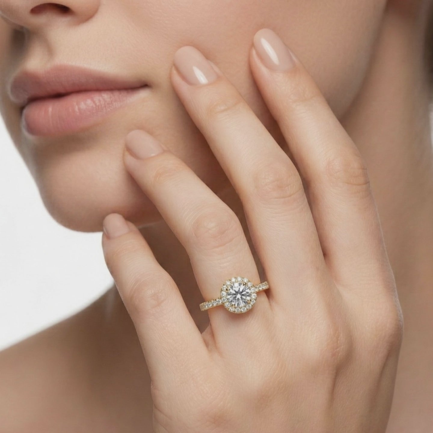 This Natural Round Diamond Engagement Ring is a symbol of love, commitment, and timeless elegance. Handcrafted with care, each piece is made using conflict-free, natural diamonds to ensure ethical sourcing and beauty that lasts a lifetime. The 0.5 carat is total weight. Round diamonds creates a sparkling, radiant effect, while the yellow gold band adds a warm, classic touch. Featuring a stunning visible halo design, this ring is perfect for those who love the glamorous look of extra sparkle. The halo of smaller diamonds surrounding the center stone enhances its size and brilliance, making the ring shine even brighter. This design is ideal for an engagement, anniversary, or a promise ring that will be cherished for years to come.