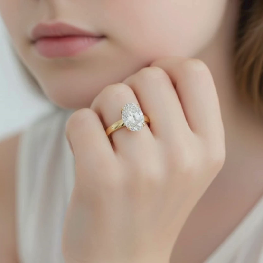 Elevate your love story with this exquisite 5 Carat Oval Lab Grown Diamond Engagement Ring. Featuring a stunning 5-carat oval-cut lab diamond, this ring is a perfect blend of luxury and modern craftsmanship. The diamond's exceptional F+ color and VS clarity ensure a brilliant sparkle, set in a chunky yellow gold band for a striking, contemporary look.